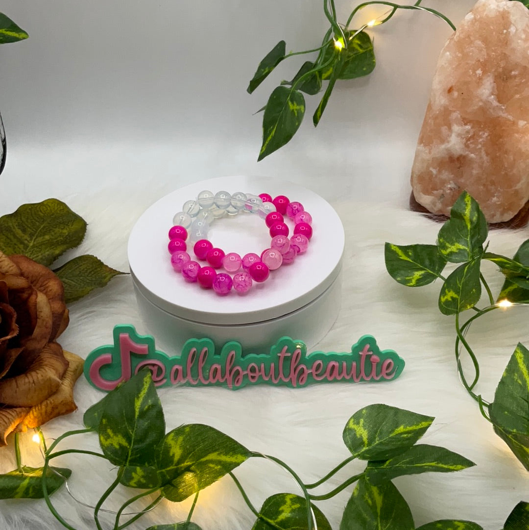 All pink bracelets in this collection are made of glass beads.